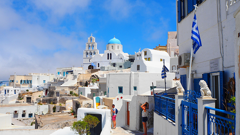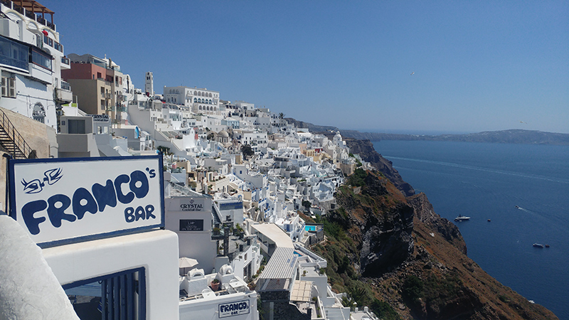 費拉:建於距離海面約300米懸崖上的城鎮,整座城鎮是緊貼著懸崖斜坡而建,由此遠眺愛琴海景緻可說是絕世美景。自由隨意地漫步於巷弄之間,處處可見如詩如畫的美景。