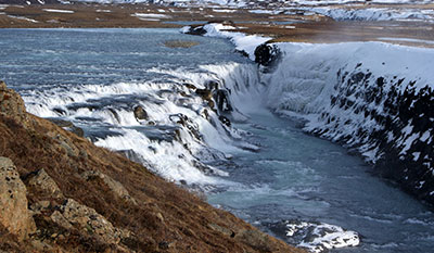 黃金瀑布:冰島第二大的瀑布,斷層峽谷形成的瀑布湍急的水流注入維塔Hvita峽谷,落差達50多公尺,形成高度不一的兩條壯觀的瀑布,澎湃的水量發出震耳欲聾的聲音,濺起的水霧在陽光的照射下會現出彩虹。