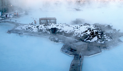 藍湖:位於一座死火山上,由部分火山熔岩形成,水溫約37-39 °C,是世界最大的溫泉湖,湖水含豐富的矽Silicon、硫磺Sulphur 等礦物質。湖底的白色物質是高含量的二氧化矽Slica泥,二氧化矽有護膚作用,在湖中浸泡後,全身肌膚會緊繃,當地人把藍湖當作天然的美容院。