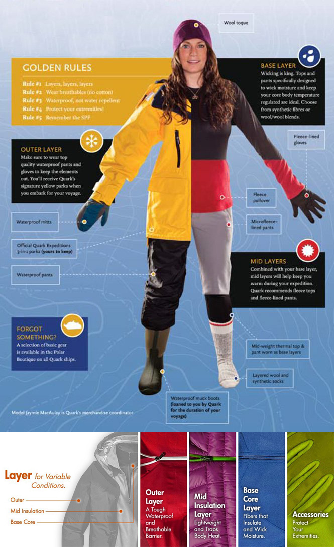 - 船公司會為旅客準備防風防水的大衣,部分更會提供防水雪褲供旅客租用。因此參加者需要攜帶的是內裡的防寒衣物,如羽絨外套、羊毛衣、冷帽等;每次登陸一般達2至3小時,建議穿著2層襪子保持雙腳溫暖。